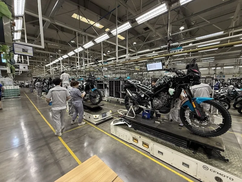 Presúvame sa ďalej a to do haly s motocyklami CFMOTO a Zeeho. Pre dnes sme vychytili výrobu najpredávanejšieho modelu 450 MT. Tu už konečne môžeme aj fotiť. V celom areály pracuje cez 8000 zamestnancov. No na tejto výrobnej linke, kde sme sa v jeden deň pri jednej smene vyrobí cez 315 motocyklov denne. Väčšinou na každom stanovišti výroby pracuje dvojica pracovníkov a v jednotlivých krokoch aj kontrolór, ktorý vždy skontroluje predchádzajúce výrobné kroky. Na konci ide motorka na motorovú brzdu, kde sa kontroluje aj v jazde. Až následne sa rozoberú niektoré diely (napr. kolesá), aby sa mohla zabaliť do prepravných boxov a bola pripravená na export.