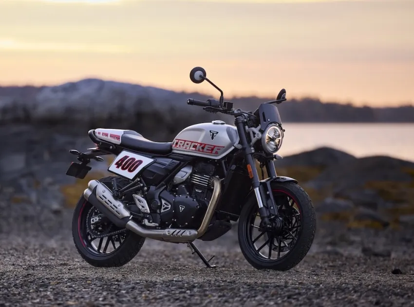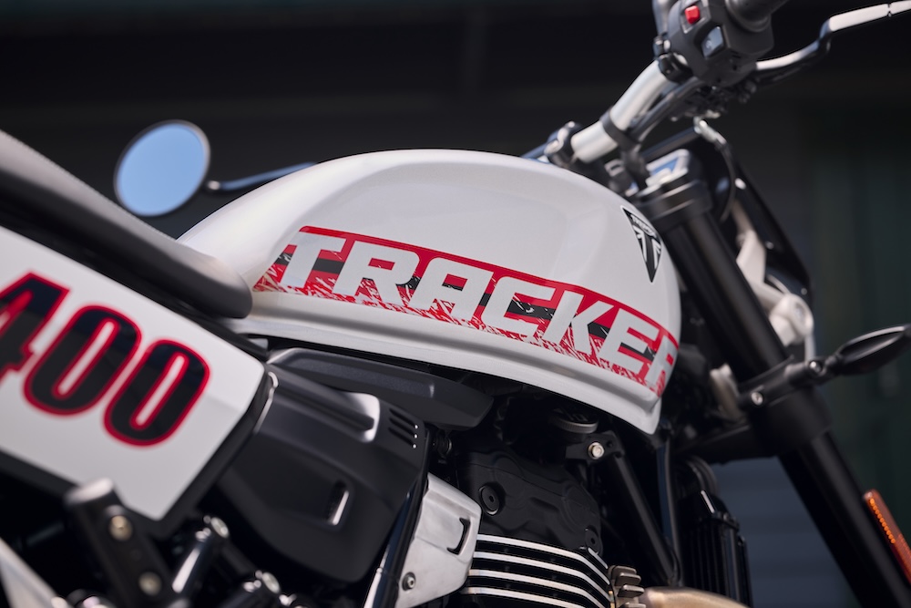 Úplnou novinkou v portfóliu značky je Triumph Tracker 400, prvý sériový model Triumphu inšpirovaný svetom flat track pretekov. Dizajn je strohý, svalnatý a jednoznačne orientovaný na vizuálnu originalitu.